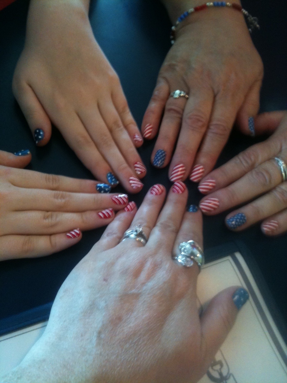 We spent today making the seven hour drive from Provo to Challis, Idaho, for Batman’s 30th class reunion. We stopped for hugs from Mindy, our extra daughter. We will get to visit with her again next week. Then we met my Mom for lunch in Blackfoot, Idaho, at Rupe’s Burgers. She looked so festive, and imagine our surprise to find we all had done the same patriotic nail art. (tiny, girlish squeal of delight)