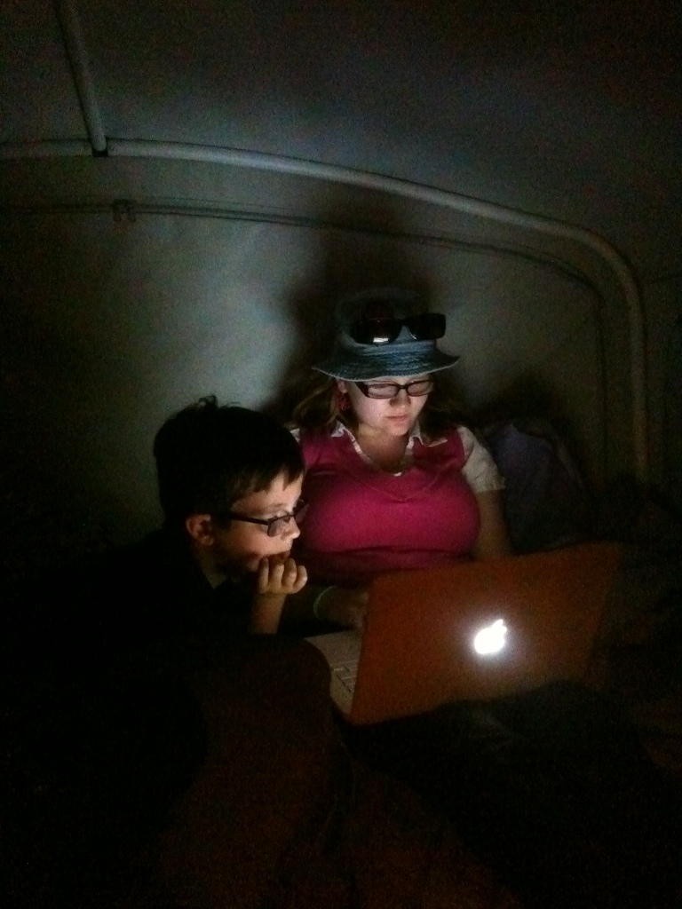 This was the scene shortly after Dale left for the airport. You can’t see that the dark shape at Jack’s right elbow is a bowl of Jiffy-Pop. They are watching Phineas & Ferb on Netflix.